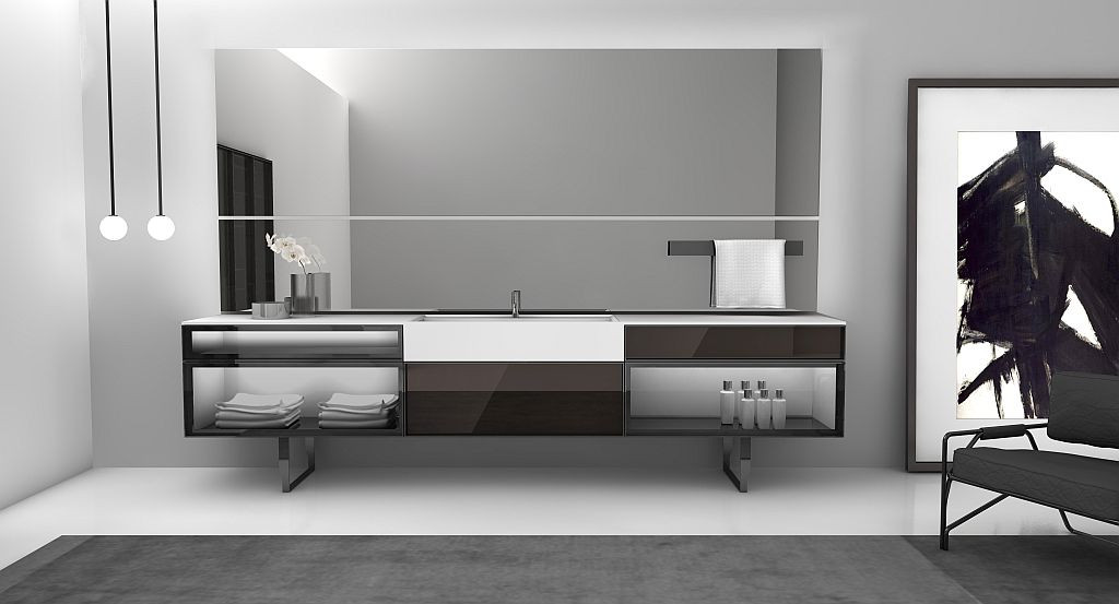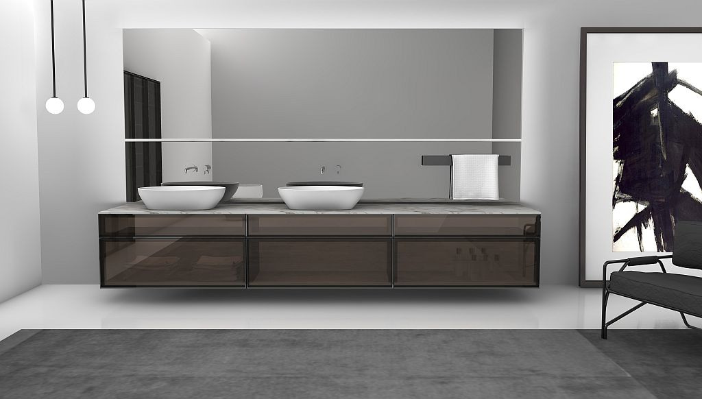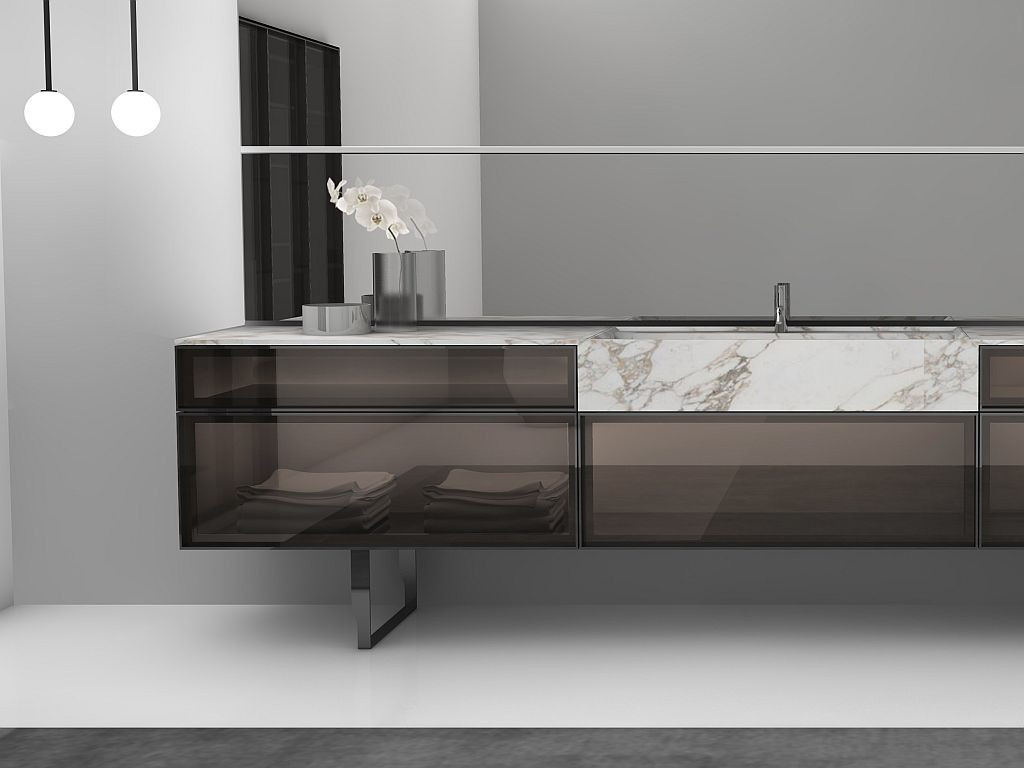 Zur Auswahl stehen unter anderem: kostbare Hölzer, matte sowie glänzende Lacke. Dazu transluzente oder kristallklare Gläser, Rahmen aus Titan oder brüniertem Aluminium. Für die Arbeitsplatte wird Quarzomood verwendet – ein Material, das antoniolupi entwickelt hat.