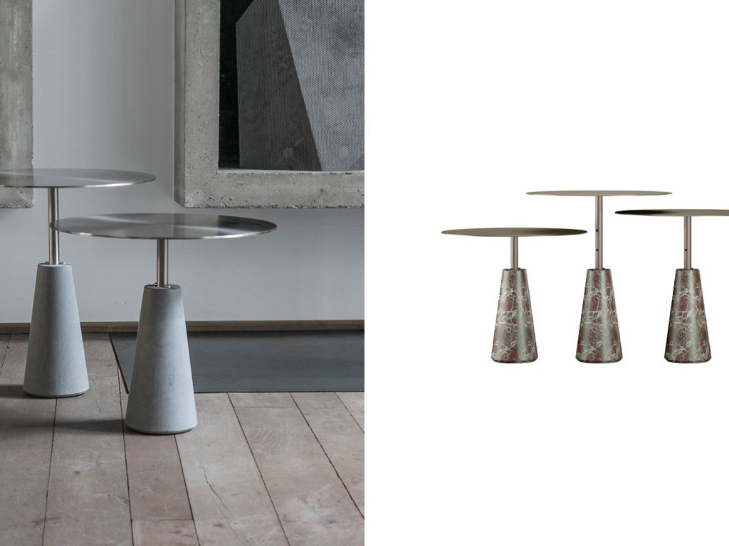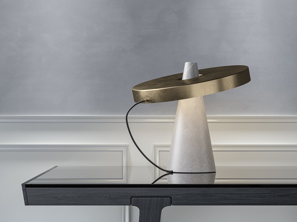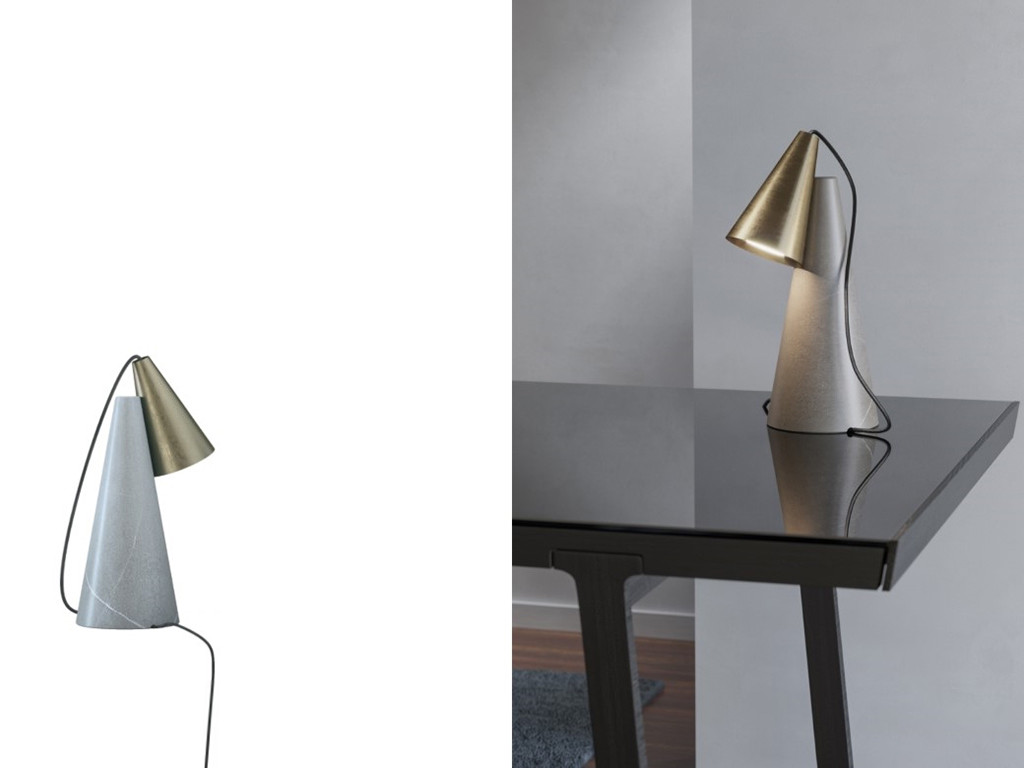Marmor, beige-weißer Kalkstein, Lacke oder galvanotechnische Nickelbeschichtungen sind oftmals kennzeichnend für die Produkte. Sie werden in streng-grafische Linien gehüllt, um die Perfektion dieser Rohstoffe zu unterstreichen. Und trotzdem: bei Edizioni liegt in den Designs immer auch etwas Lustiges, Radikales — nicht zuletzt Funktionales. So wie bei der Lampe ed038 aus dem Jahr 2017, die mit ihrer verstellbaren Zipfelmütze aus Bronze punktgenau strahlt.