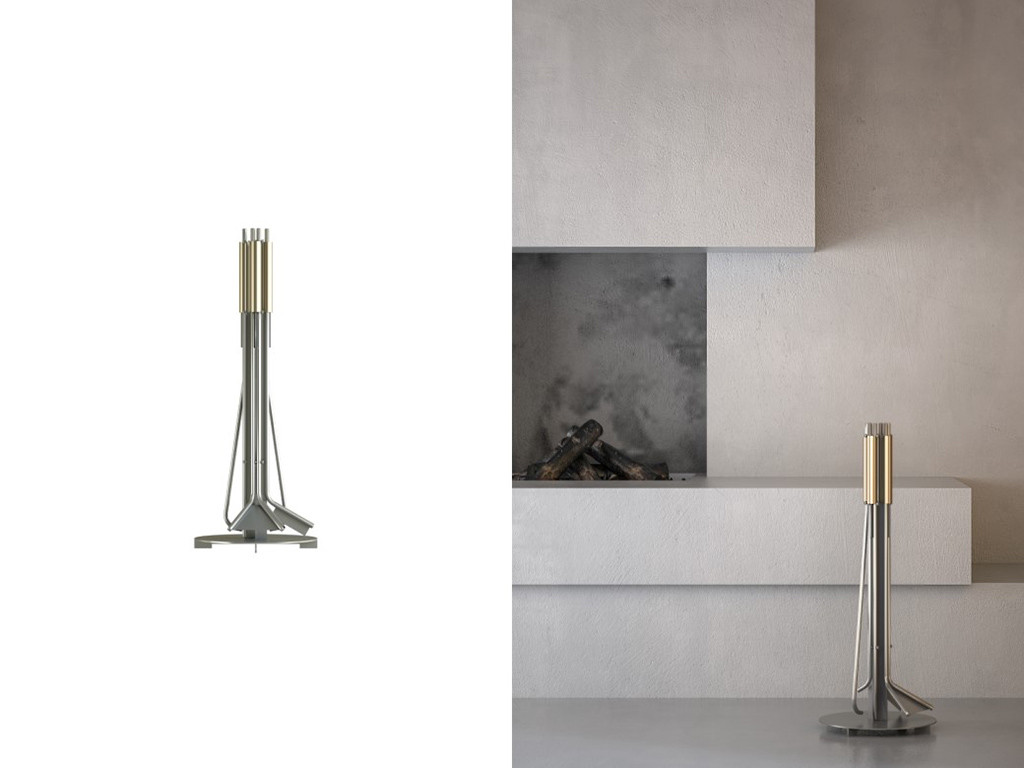 Die allerersten Produkte des Hauses waren schlicht, doch keineswegs unspektakulär. ›Edizioni Design‹ präsentierte während der Möbelmesse in Mailand minimalistische Werkzeuge für den Kamingebrauch. Vom extravaganten Funkenschutz über propellerartige Feuerböcke bis hin zum Kaminbesteck aus Stahl und Messing (s. oben: Schürhaken, Bürste, Feuerzange plus Schaufel).