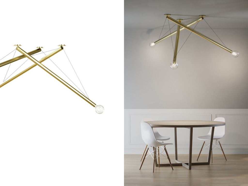 Erst mit der Kollektion #3 (also 2016) eroberten die Mailänder dann auch den Luftraum. Ein asymmetrischer Chandelier, dessen Metallarme wie überdimensionale Streichhölzer unter der Zimmerdecke aufragen, erlaubt grafische Installationen mit einer Spannweite zwischen 160 und 210 cm. Ob spitz oder breit oder quer — fast alles geht dank einer dreigeteilten Aufhängung.