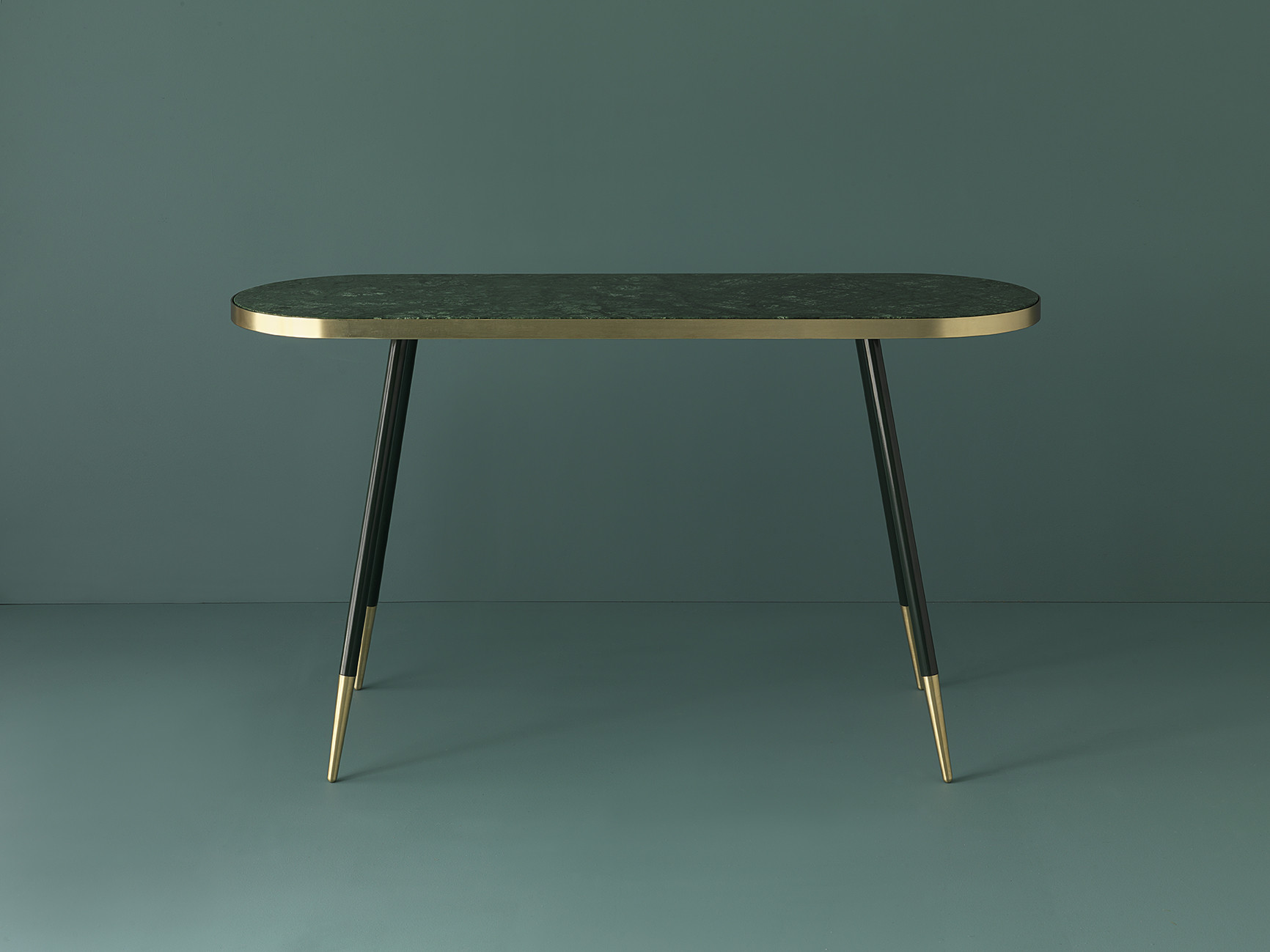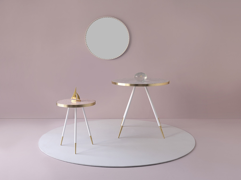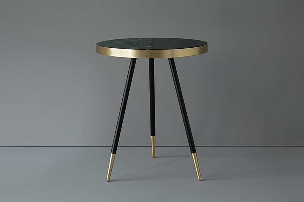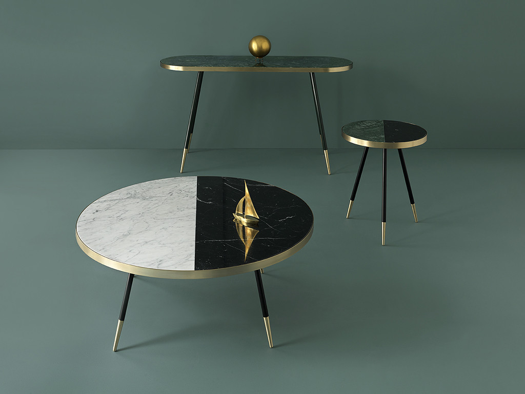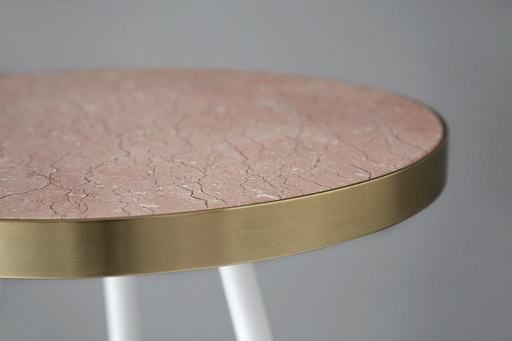 Gleiches gilt für die Farben. In der sogenannten ›Band Range‹ gibt es Nuancen, die fast schon aus der Mode gekommen sind – Tannengrün und Altrosa zum Beispiel. Doch bei Bethan Gray wirken diese Farbtöne unkompliziert und frisch. Die Kompositionen ergeben sich jeweils aus dem Marmor, der übrigens ausschließlich aus Steinbrüchen in Europa stammt. Um den Möbeln eine kraftvolle Ästhetik zu geben, wird der Naturstein per Hand in einen Messingring gefasst.