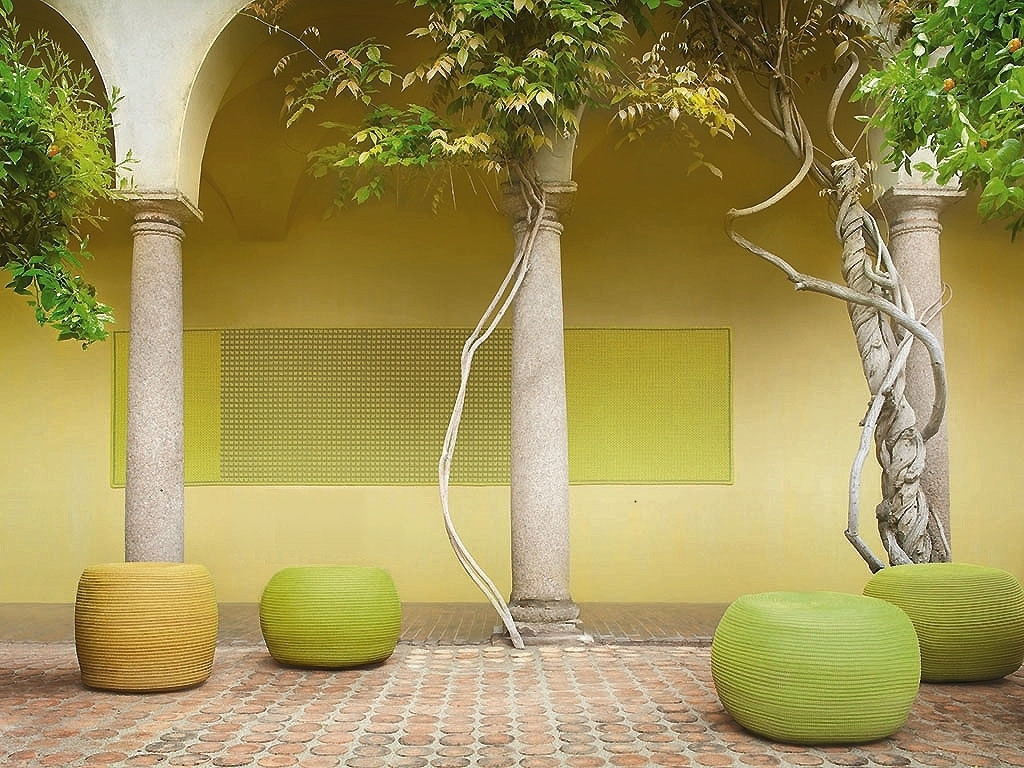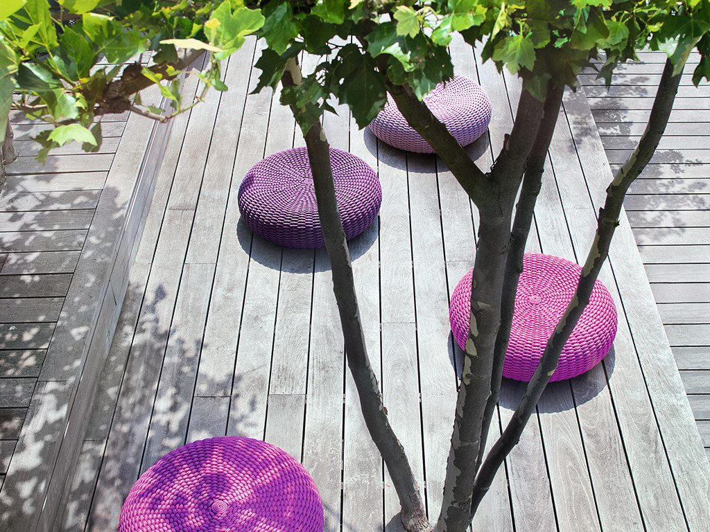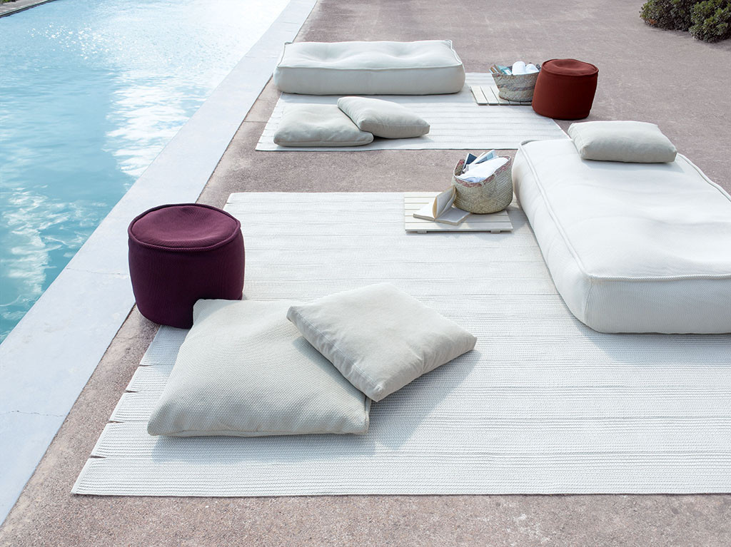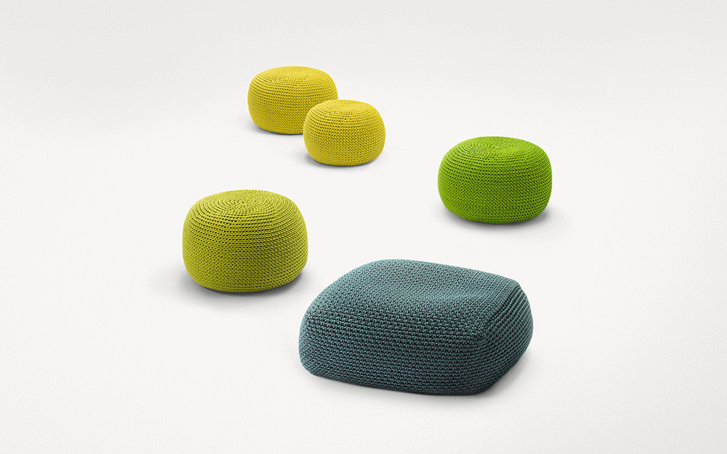 Nun, inzwischen umspannen die Kollektionen von ›Paola Lenti‹ eine ganze Welt. Sie hat Sitzkissen und matratzenähnliche Liegen in den Gartenbereich gebracht, Sessel mit gewebten Strukturen dafür ins Wohnzimmer. Nichts aber steht für die hohe Kultur dieses Unternehmens so beispielhaft wie die Poufs: schlicht, ergreifend, feinsinnig – wie auch die Poufs ›Picot‹.