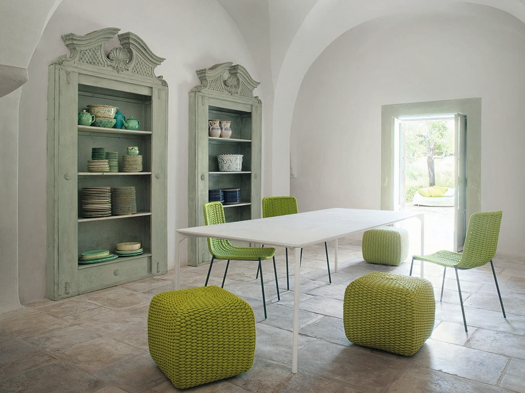 Möglich werden derart wetterintensive Einsätze durch die Verwendung einer sehr speziellen Faser. Jahrelang tüftelte Paola Lenti, die Firmengründerin und schöpferische Leitfigur hinter der Marke, an der Entwicklung von soften, aber gleichwohl wasserresistenten Materialien. Sie erfand das Robe-Garn, das eben solche Eigenschaften besitzt – und zwar in leuchtenden Farbtönen.