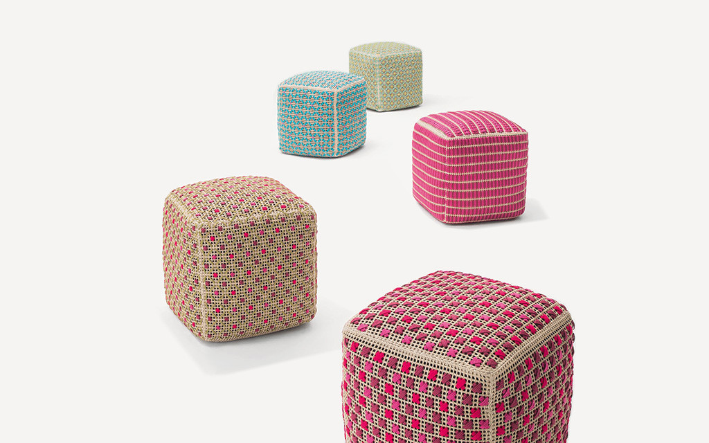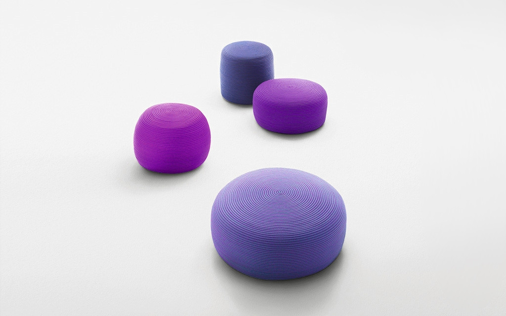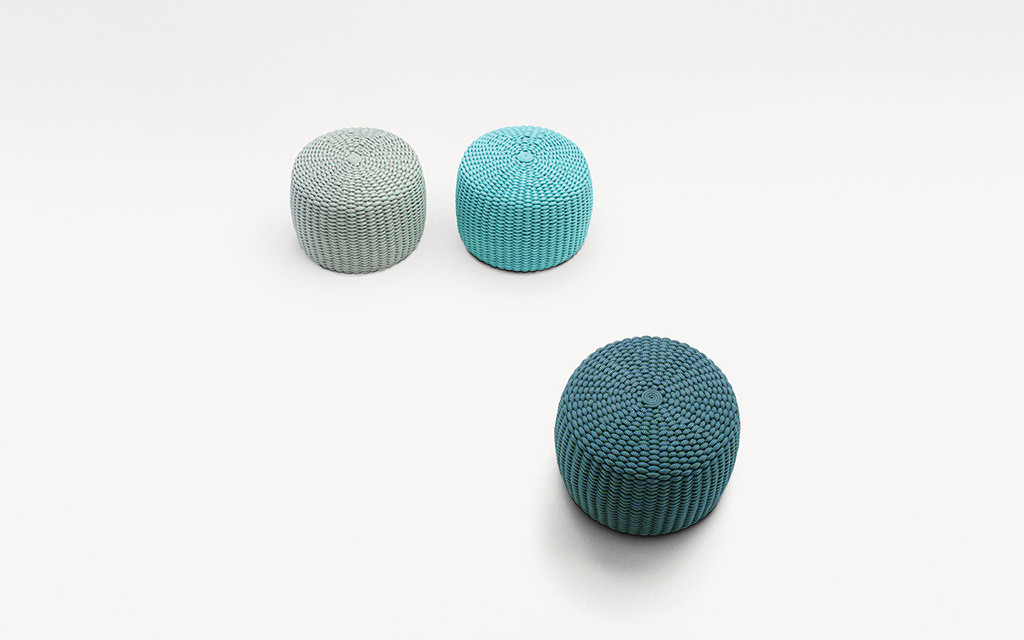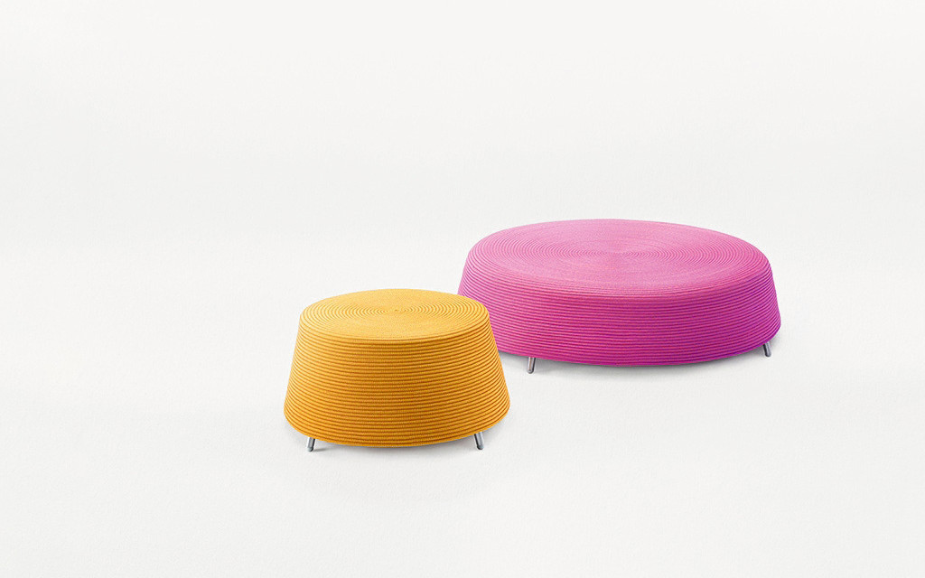 Silber, Aquamarin, Koralle oder schillernde Rosétöne sind deshalb Nuancen, die sich in der schier uferlosen Farbauswahl des Unternehmens überall wiederfinden. Für die 42 cm hohen Hocker der Serie ›Nido‹, bei denen die Kordel in aufwendiger Handarbeit verwebt wird, gibt es wahlweise auch raffinierte, 2-farbige Twin-Garne. Design: Patricia Urquiola, Eliana Gerotto.