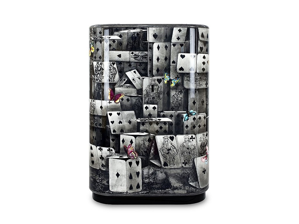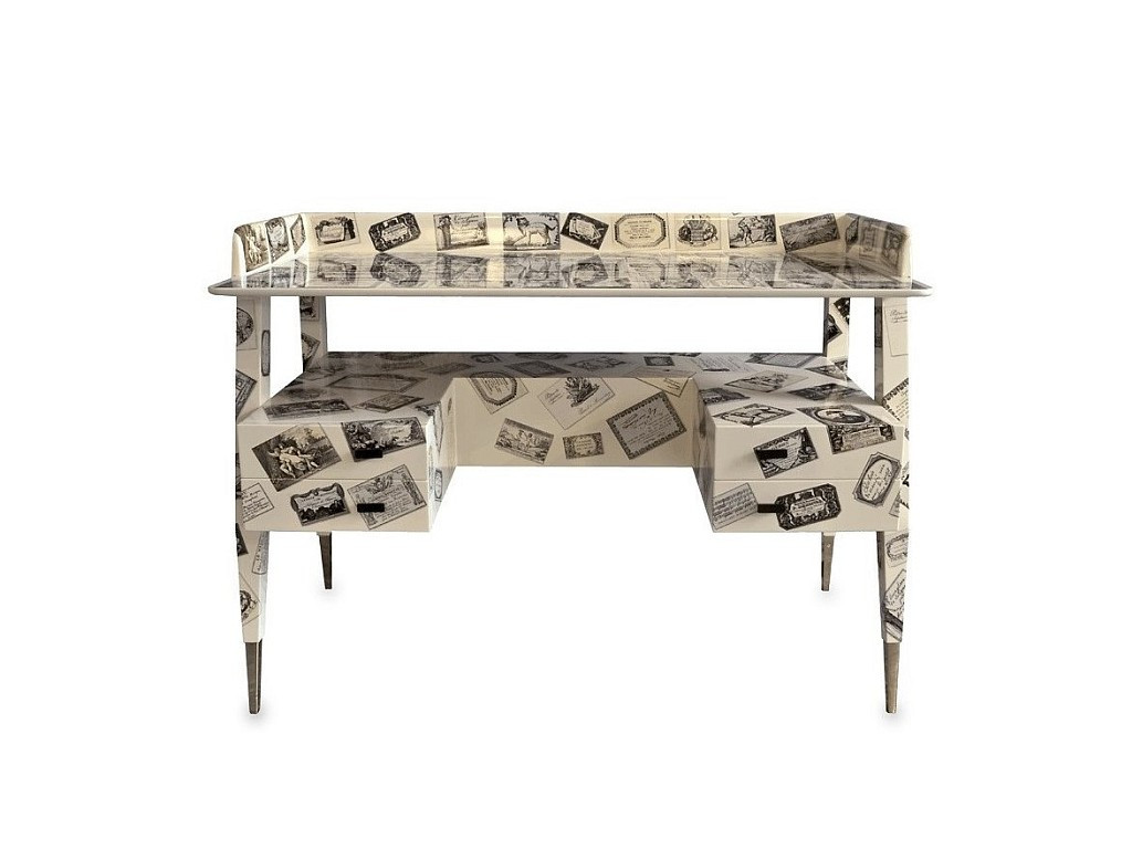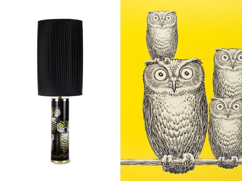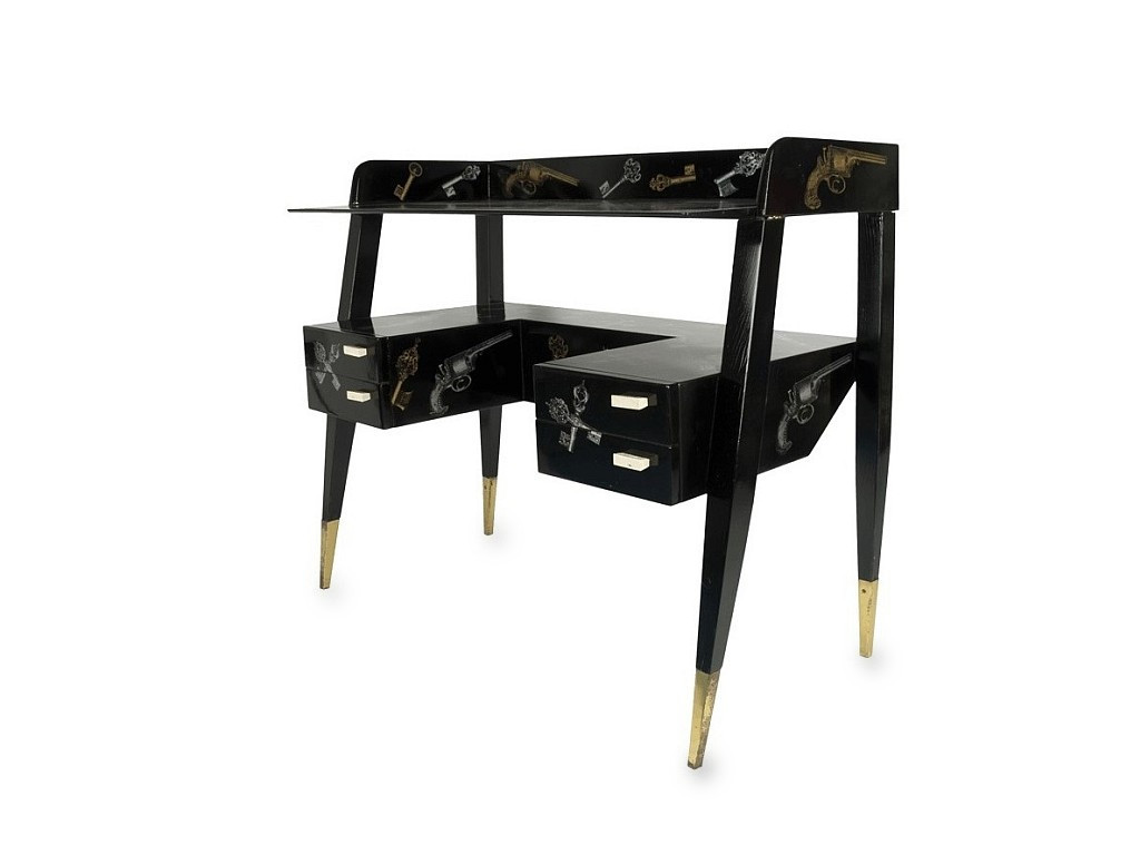 So entwarf Gio Ponti in den 50er Jahren mehrere Möbel, die Fornasetti wiederum mit seinen hintergründigen Motiven veredelte. Praktisch das gesamte Vokabular seiner Kunst hat der Meister der skurrilen Töne in dieser Zeit ausformuliert – Klampfen und Pistolen, Schmetterlinge und Eulen, Mützen und Hüte, Fische und Vögel, Montgolfieren und Ritterrüstungen, etc.