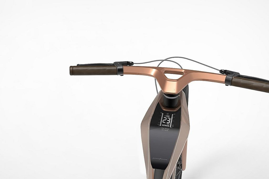 Neben vielen anderen Superlativen, die es gleich zu besichtigen gilt, prangt über dem ersten Elektrofahrrad von Pininfarina nun also auch die Auszeichnung: Eurobike 2016. Gewürdigt wurde vor allem die Verbindung von Dynamik und Komfort. Integration ist in diesem Kontext ein Schlüsselwort. Denn Pininfarina ist es gelungen, nicht nur Motor, Kabel und Batterie im Rahmen zu verstecken. Auch die Lichtanlage und das Info-Display sind hier sauber verstaut.