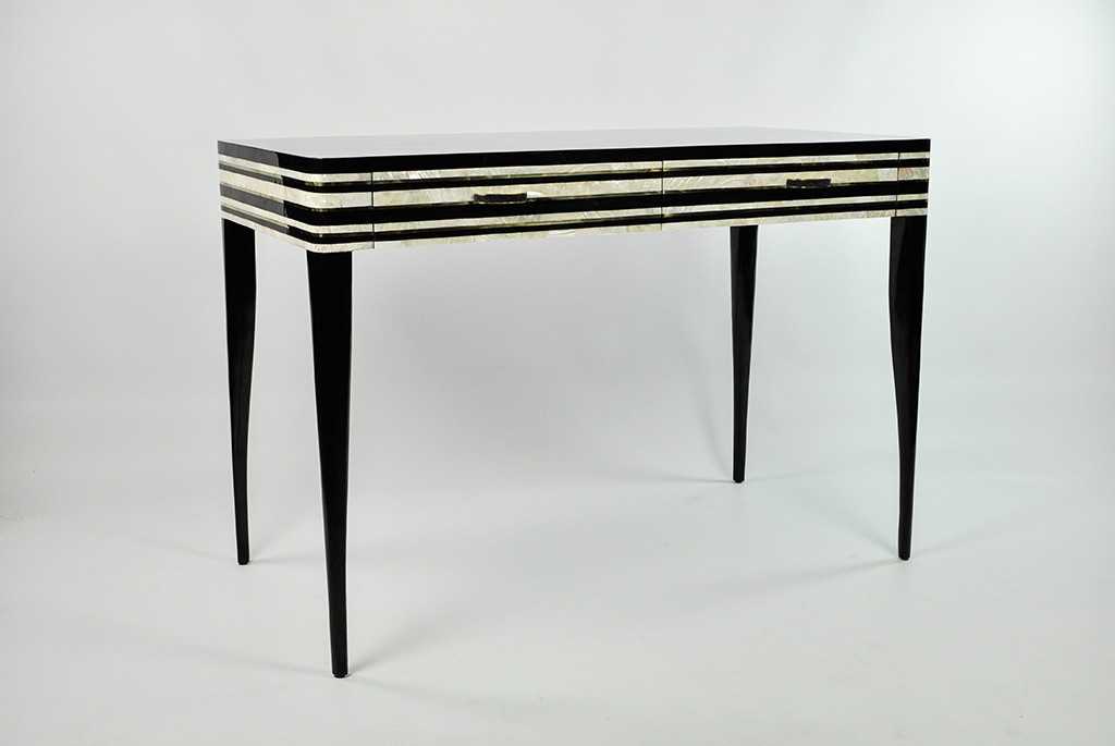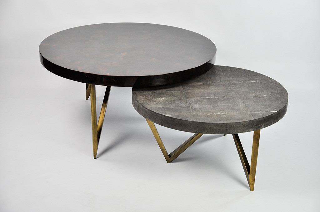 Es sind Materialien, die einfach selten sind. Ginger Brown greift unbekümmert in Töpfe, die selbst in höheren Kreisen als massiver Luxus gelten. Nehmen wir die Kommode vom Bild eins: gold-braune und perlmuttweiße Muschelschalen, dazwischen Rochenleder und Brillantlack. Oder die Sofatische oben: Rochenleder und Steckmuschelschalen, dazu goldgefärbte Metallfüße.