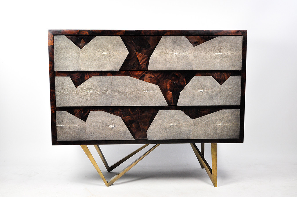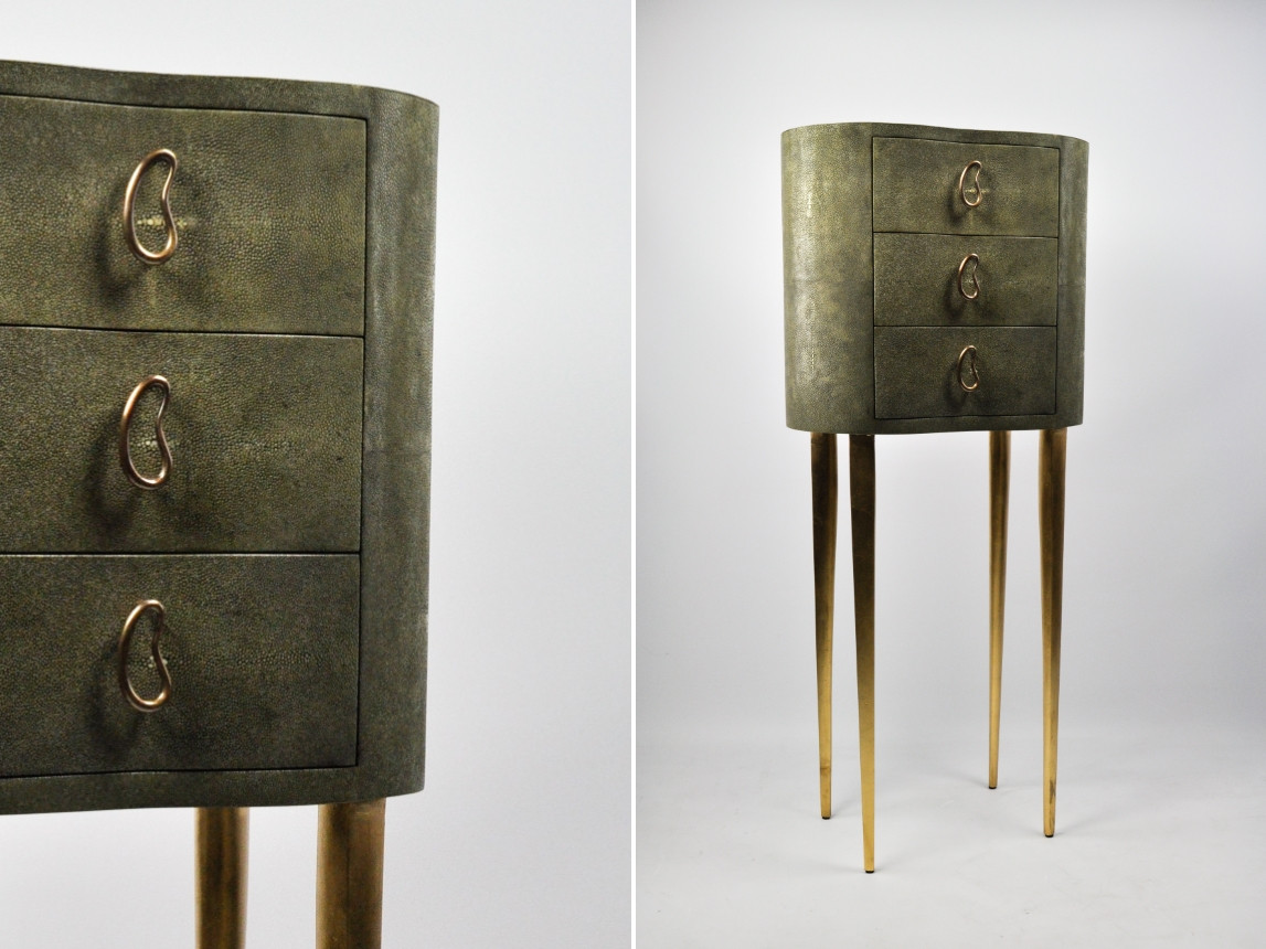 Jedes Stück ist ein Einzelstück. Nicht nur, weil die gesamte Fertigung bei ›Ginger Brown‹ auf Handarbeit beruht. Auch die Naturmaterialien, die eingesetzt werden, schaffen eigene Facetten. Oben im Bild sieht man das Kabinett CB Stellar, das 115 cm hoch, 50 cm breit und 30 cm tief ist – aber je nach Rochenhaut kann die Farbe bei diesem Möbel von hell- bis dunkelgrün variieren.