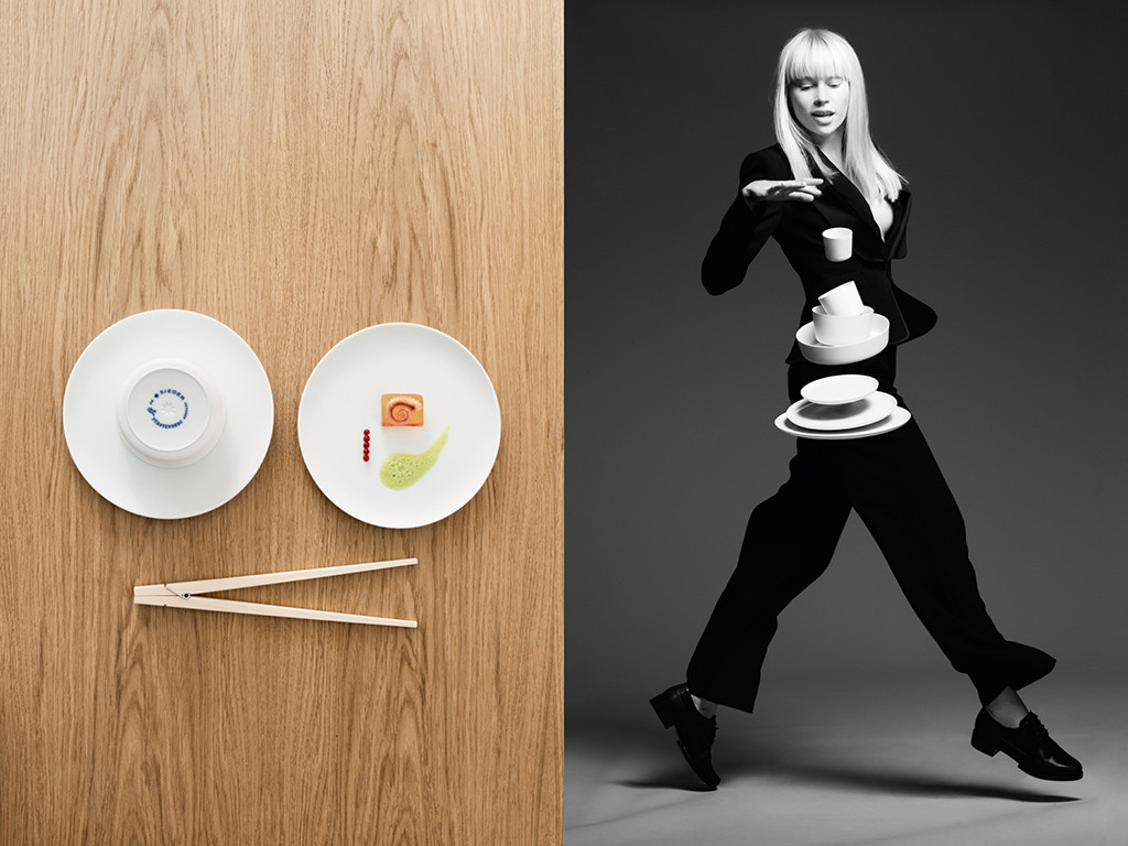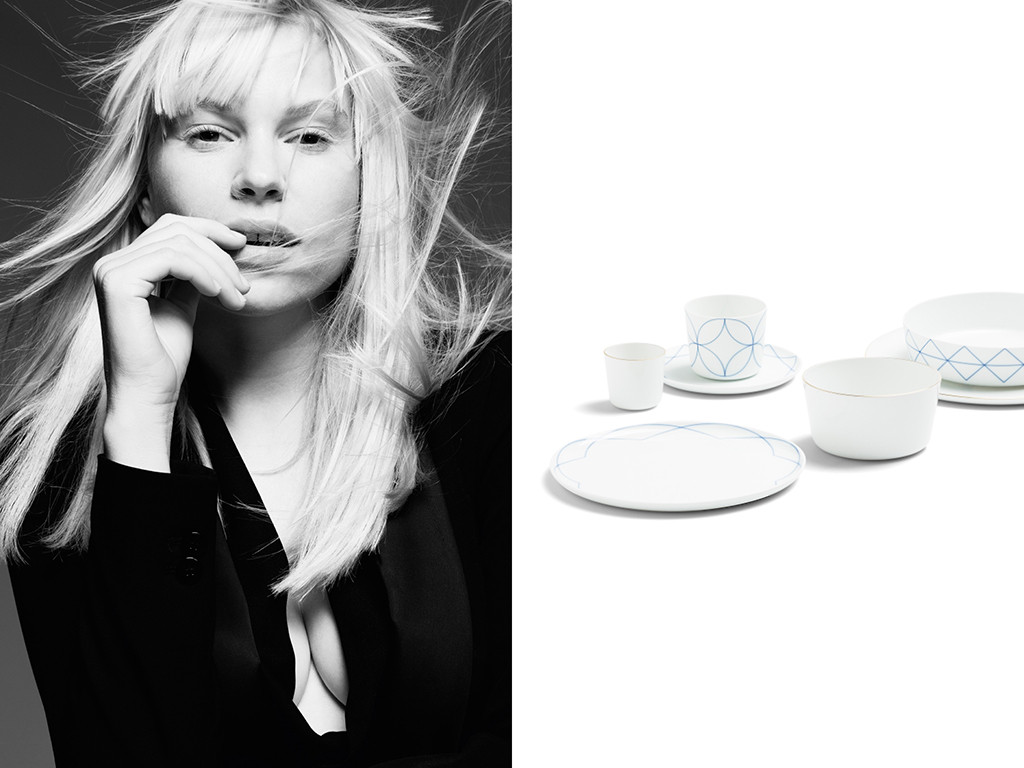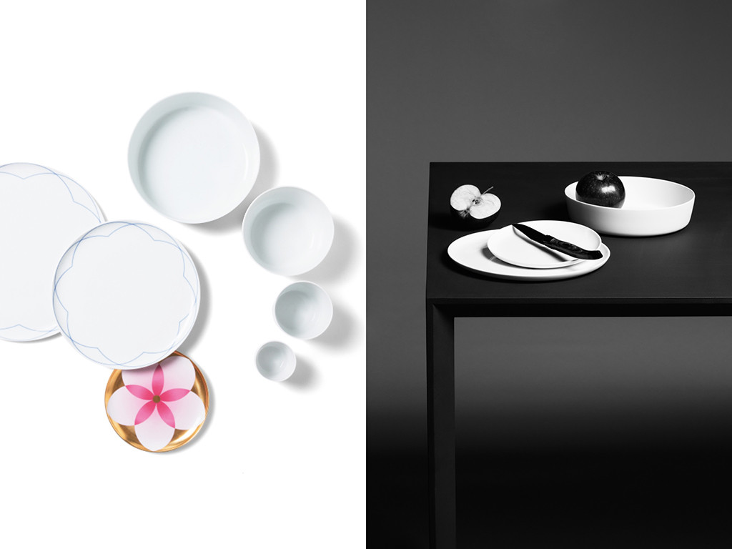 Aus nur sieben Teilen besteht ›Seven‹, wobei sich das Auge an den Stücken kaum satt sehen kann. Denn neben einer weißen Ausführung gibt es fünf extravagante Dekore, die sich allesamt kombinieren lassen. Oben: Blaue Geometrien neben Light Gold. Bild unten: Dekor Hanami.