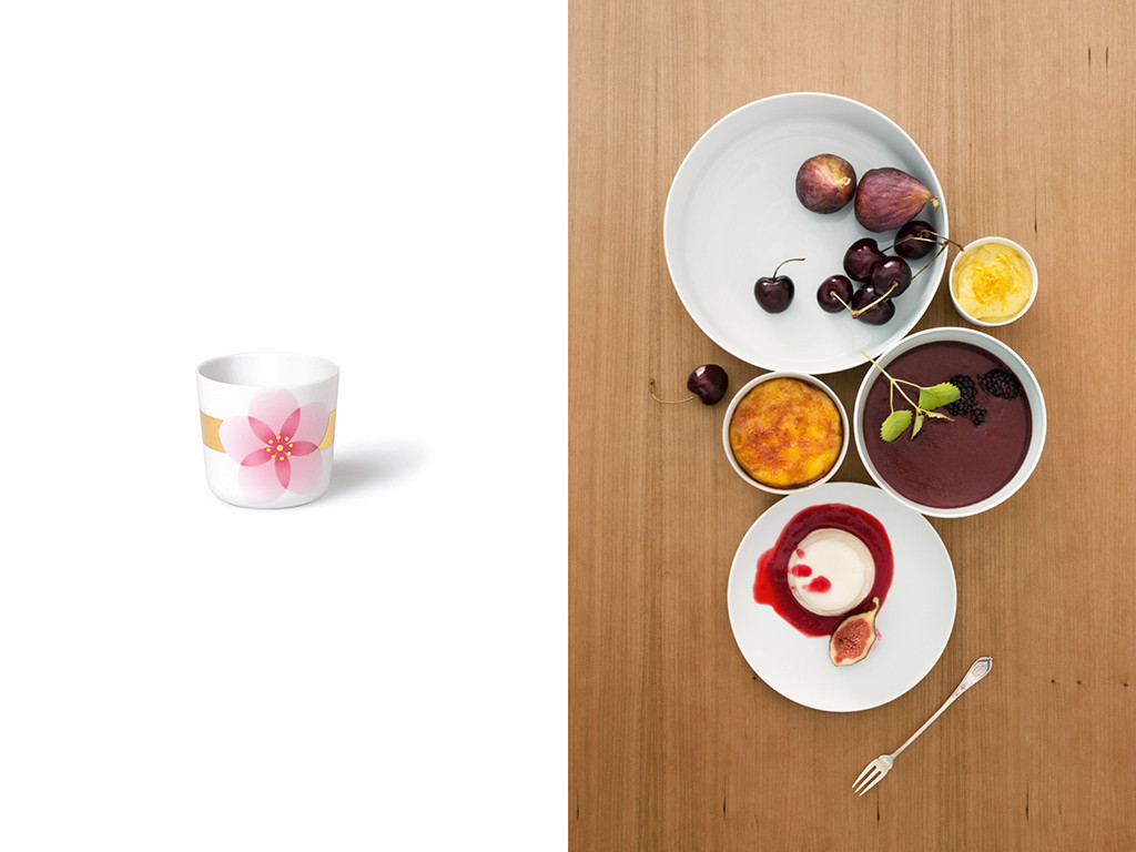 Hanami ist von der japanischen Kirschblüte inspiriert, dem Symbol für Schönheit. Die Teile werden sowohl innen wie auch außen glasiert und in reinster Handarbeit mit 24-karätigen Poliergold veredelt. In den Ateliers der Porzellanmanufaktur Fürstenberg geht jedes Stück durch bis zu 100 Hände, bevor das Ganze dann als glitzerndes Unikat auf Ihrem Tisch landen darf.