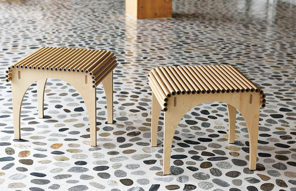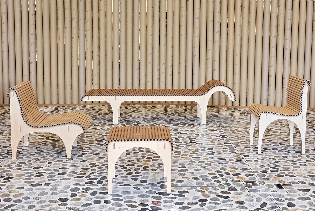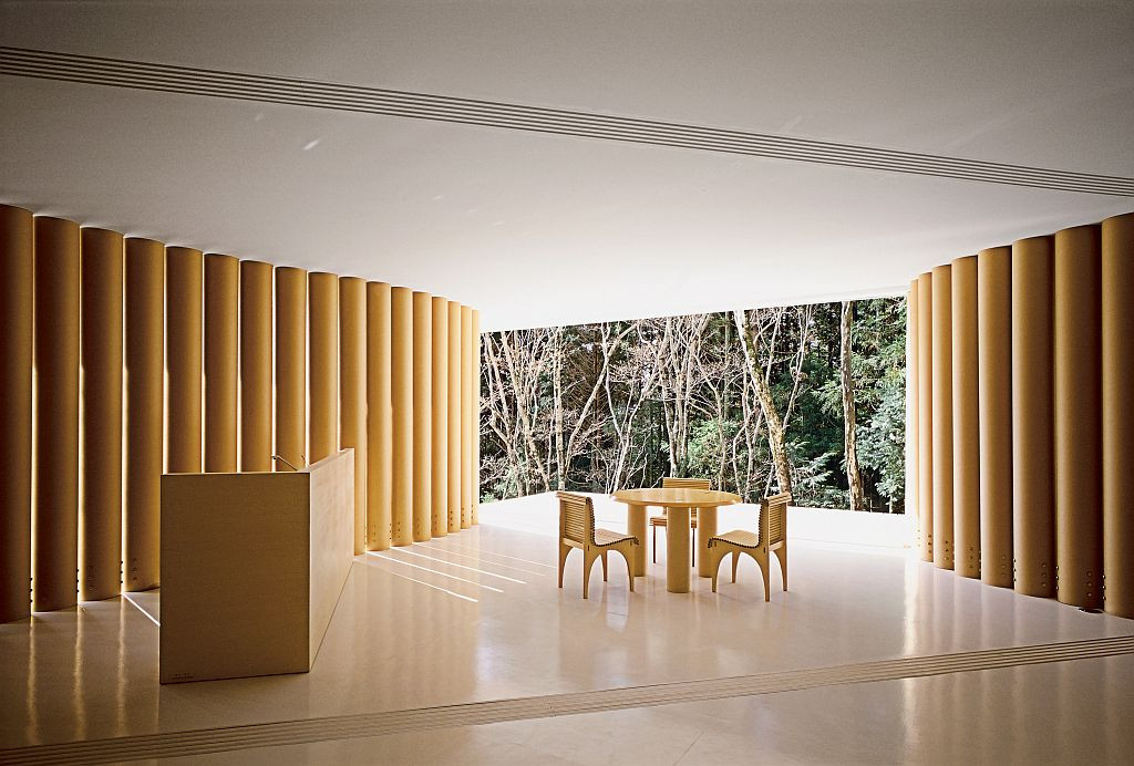 Kartonröhrchen schlängeln sich in dichten Reihen über Gestelle aus Birkenholz. Was so einfach klingt, ist gleichwohl spektakulär. Stammen die Entwürfe doch allesamt von Shigeru Ban.