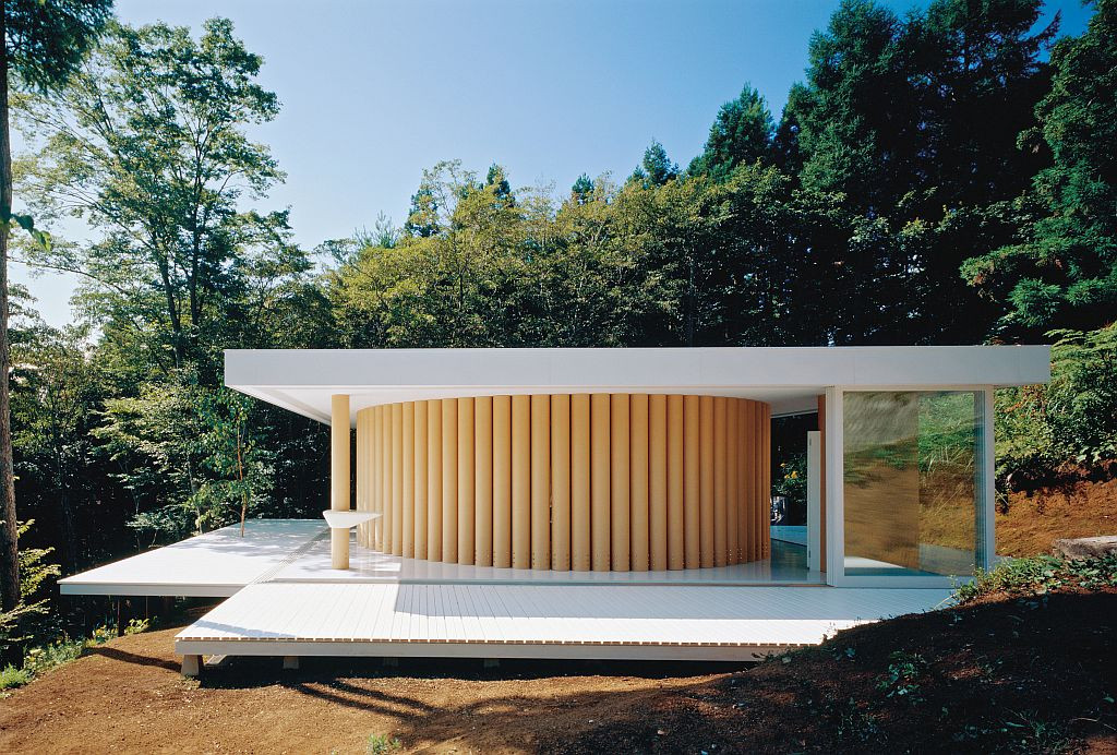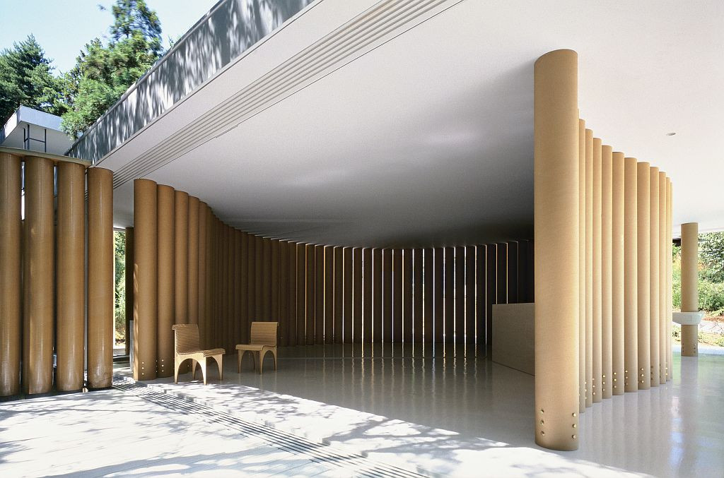 »Papier ist das bessere Holz,« sagt Shigeru Ban. 1995 gelang es ihm erstmals, die behördliche Genehmigung für ein Haus zu bekommen, dessen Wände aus Pappe waren. Direkt an einem der fünf Fuji-Seen entstand das legendäre Paper House, bei dem 110 kolossale Kartonrollen über eine s-förmige Konfiguration sowohl die äußere Hülle als auch das Innere bildeten (Bilder 2, 4, 6).